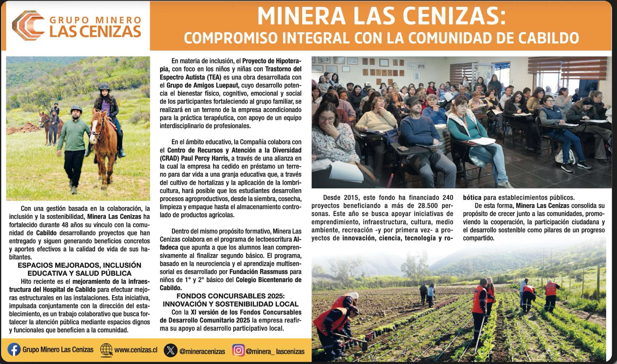 • El viernes 17 de octubre, Minera Las Cenizas Faena Cabildo fue parte de la edición especial por los 55 años del Diario El Observador, medio que informa a las provincias de Quillota, San Felipe, Los Andes, Petorca, Marga Marga y Valparaíso.