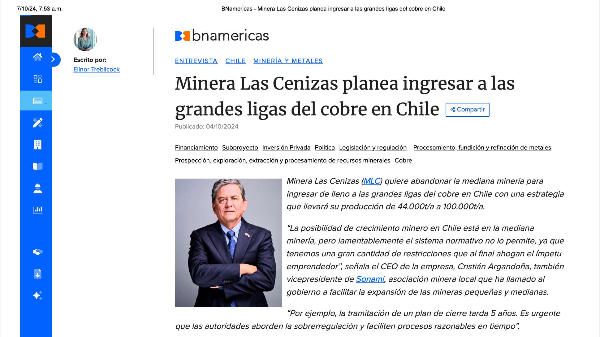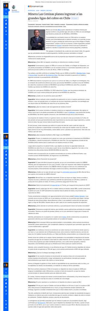 · Transcribimos entrevista al Gerente General, Cristián Argandoña, realizada por el portal web BNamericas, en su edición del 04/10/2024.