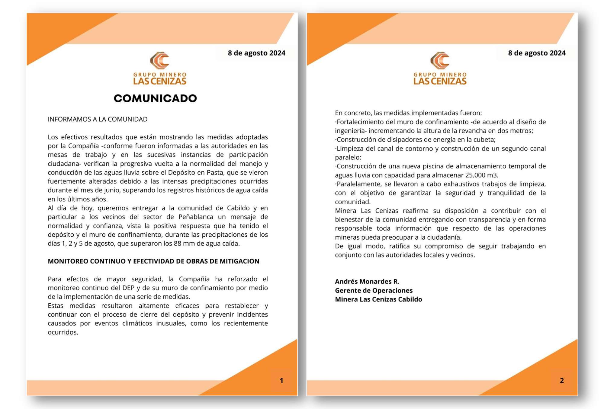 Para disipar cualquier preocupación que la instalación  pudiera generar a los vecinos de la comuna después de las lluvias ocurridas a principios de agosto, la comunicación -emitida por el Gerente de Operaciones de Faena Cabildo, Andrés Monardes- fue enviada a los distintos actores sociales ,autoridades, vecinos  y medios de comunicación  de la comuna .