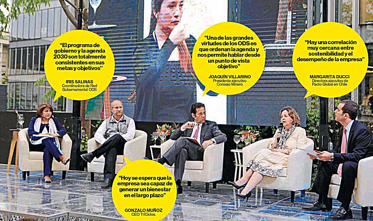 'Chile en camino a la Agenda 2030 para el Desarrollo Sostenible' fue el centro del diálogo, integrado por Joaquín Villarino, presidente ejecutivo del Consejo Minero; Margarita Ducci, directora ejecutiva de Pacto Global en Chile; Gonzalo Muñoz, CEO de TriCiclos y cofundador de SistemaB; Jonás Preller, director de PULSO, e Iris Salinas, coordinadora de Red Gubernamental ODS.