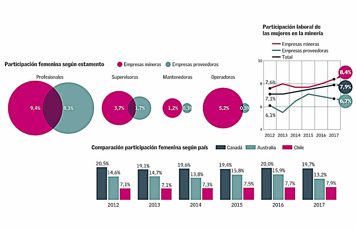 En el rubro minero, el 7,9% de los trabajadores son mujeres. En el caso de las compañías mineras este indicador se empina al 8,4%, mientras que en las empresas proveedoras llega al 6,7%, según el "Estudio de Fuerza Laboral de la Gran Minería", que el Consejo de Competencias Mineras (CCM) del Consejo Minero dará a conocer en noviembre y que adelantó para "El Mercurio".