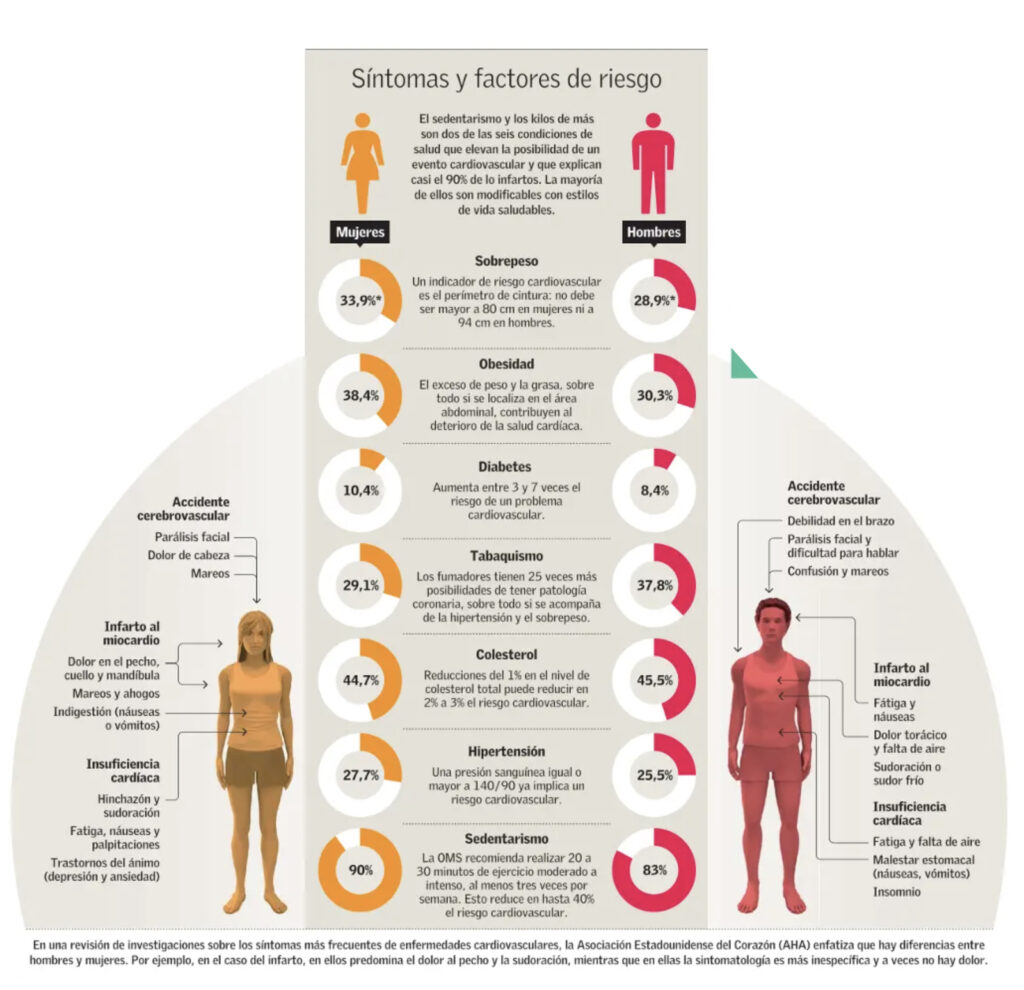 El corazón y las arterias, en las mujeres, son más pequeños que los de los hombres. «Con el paso de los años, mientras en los hombres el músculo cardíaco se hace más grande y grueso, en las mujeres suele mantener su tamaño e incluso achicarse», dicen los especialistas, «de aquí que las mujeres tienen mayor riesgo de desarrollar coágulos o bloqueos de la placa arterial».