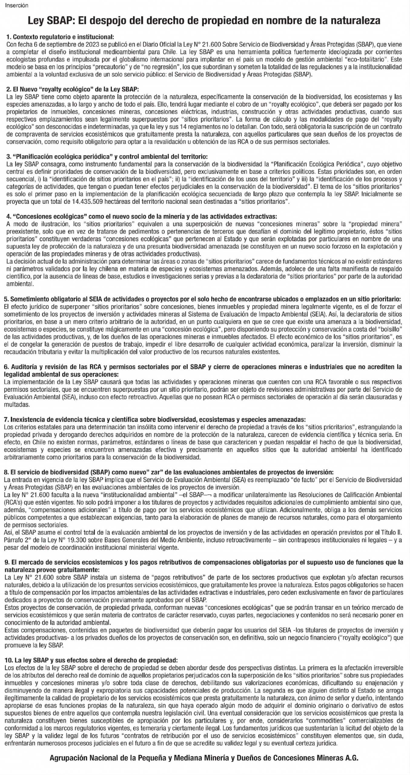Debate en torno a la Ley 21.600 (SBAP) vuelve a encenderse luego de que la Agrupación Nacional de la Pequeña y Mediana Minería publicara un inserto acusando que la Ley SBAP crea un sistema que: