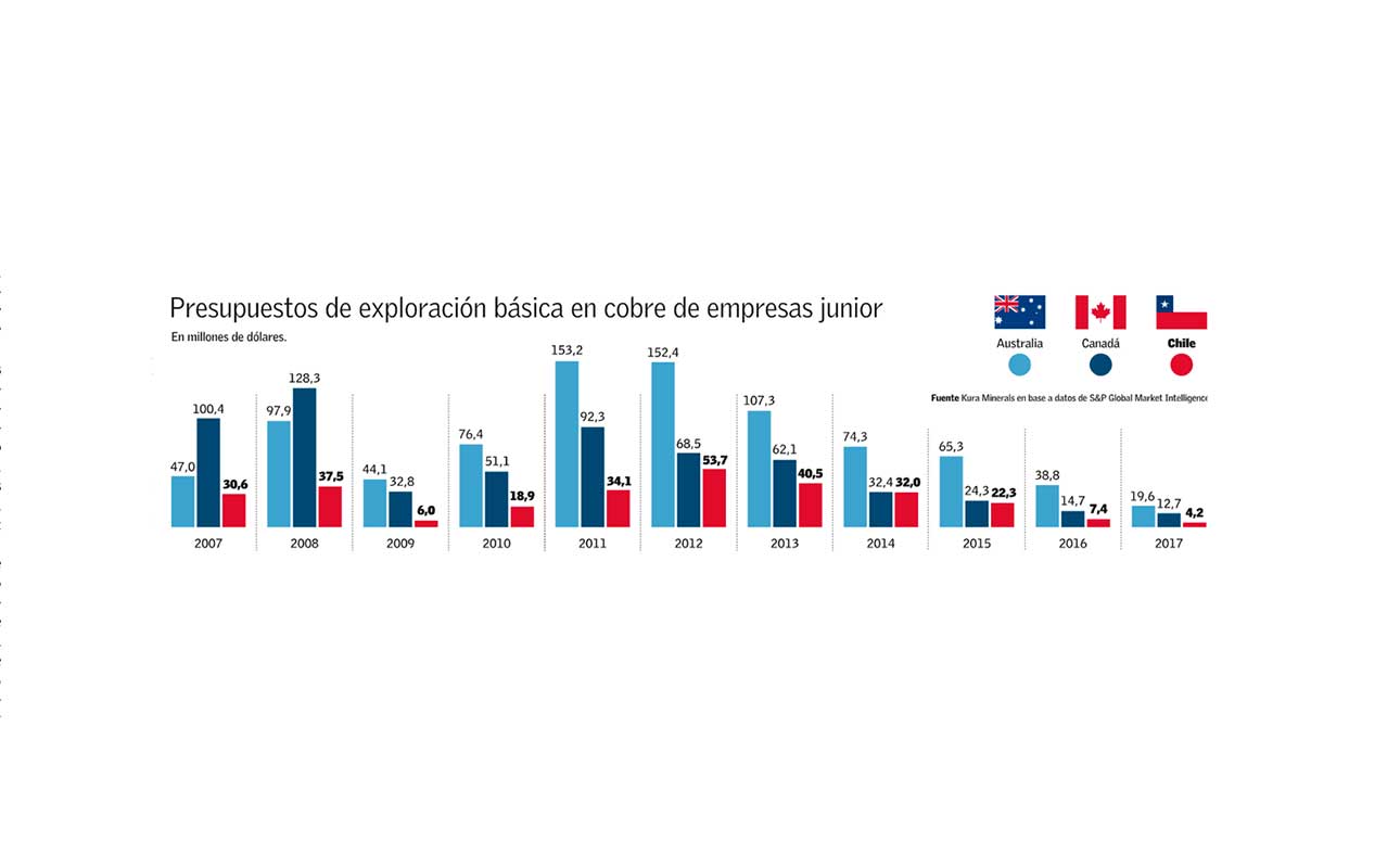 En 2017 el presupuesto de las juniors -especialistas en el descubrimiento de potenciales yacimientos- para exploración básica en iniciativas de metal rojo alcanzó los US$ 4,2 millones en Chile, de acuerdo con un análisis realizado por Kura Minerals en base a cifras S&P Global Market Intelligence.
