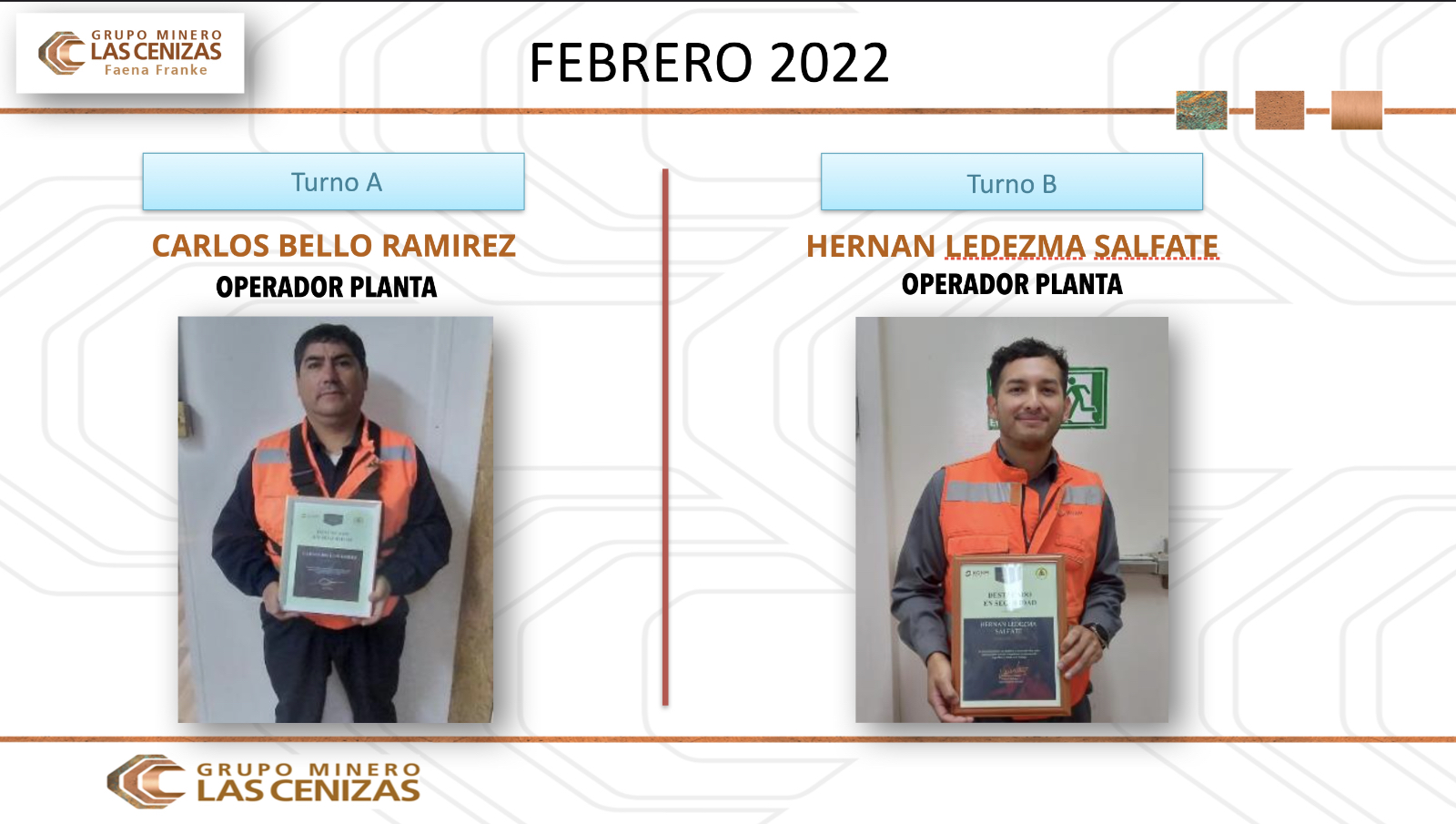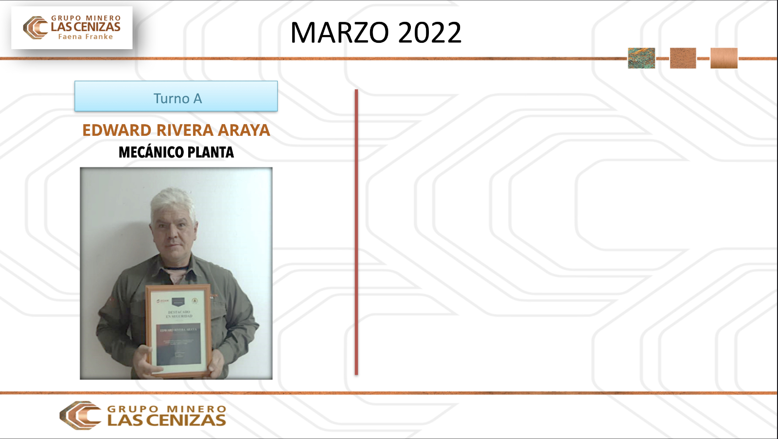 La actividad Premiación se realiza en la Reunión de Seguridad Mensual de la faena, donde la jefatura directa hace entrega de un Diploma con la presencia de todos sus compañeros de trabajo.