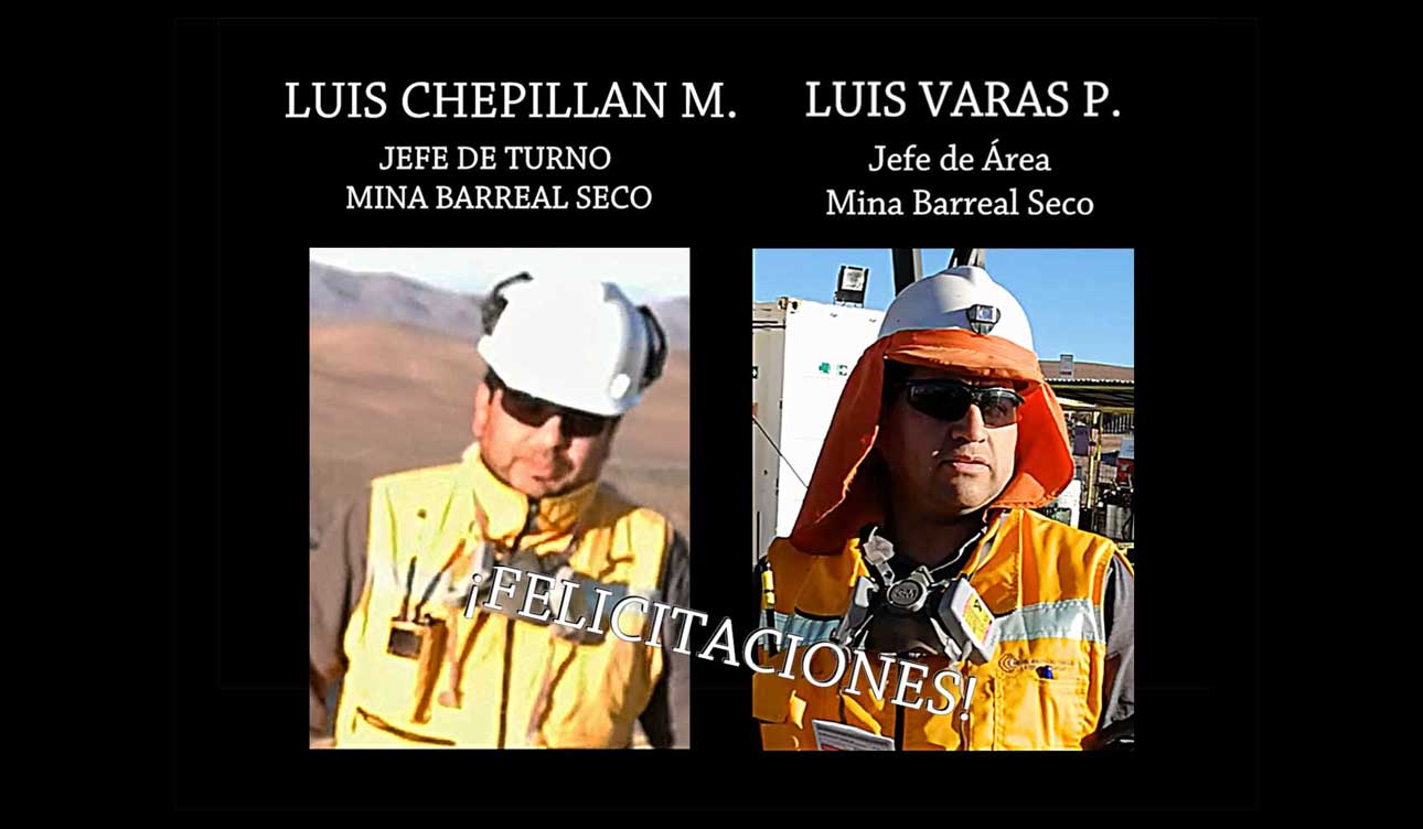 En el contexto del compromiso de la Compañía con el valor de la Prevención y dentro del desarrollo del Programa Acercamiento Stop, fueron reconocidos por su destacado desempeño, entre enero a marzo 2017, Luis Varas, Jefe de Área Mina Barreal Seco y Luis Chepillán, Jefe de Turno Mina Barreal Seco.