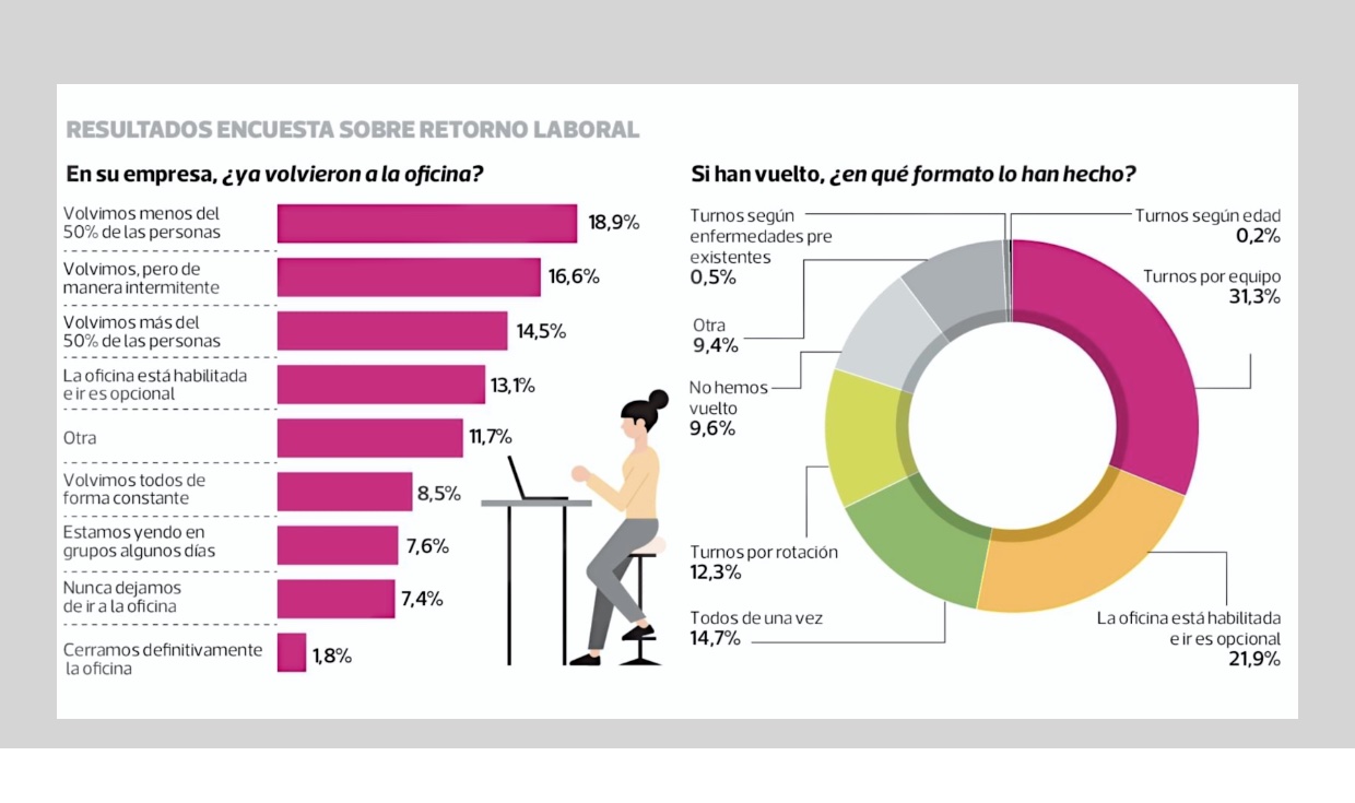 Según los resultados del estudio, denominado "Vuelta a la oficina", una abrumadora mayoría de ellas regresó de cierta manera a las labores presenciales, aunque con restricciones, en grupos o de manera intermitente.
