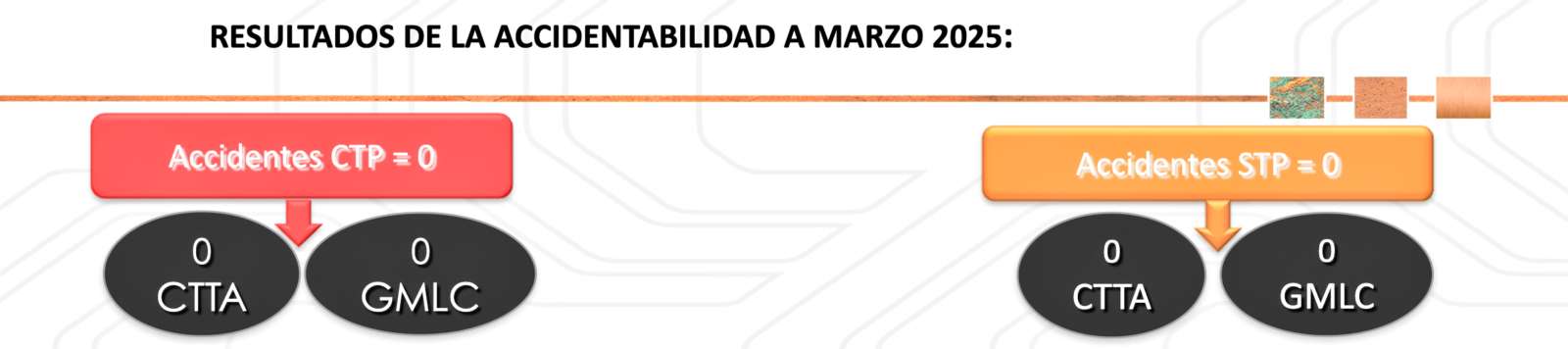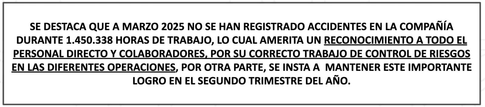 - Al mes de marzo de 2025 no se han registrado accidentes en la Compañía durante 1.450.338 horas de trabajo, lo que merece un reconocimiento a todo el personal directo y colaboradores por su adecuado control de riesgos en las distintas operaciones. Por lo mismo, hacemos un llamado a mantener este logro en el segundo trimestre del año.
