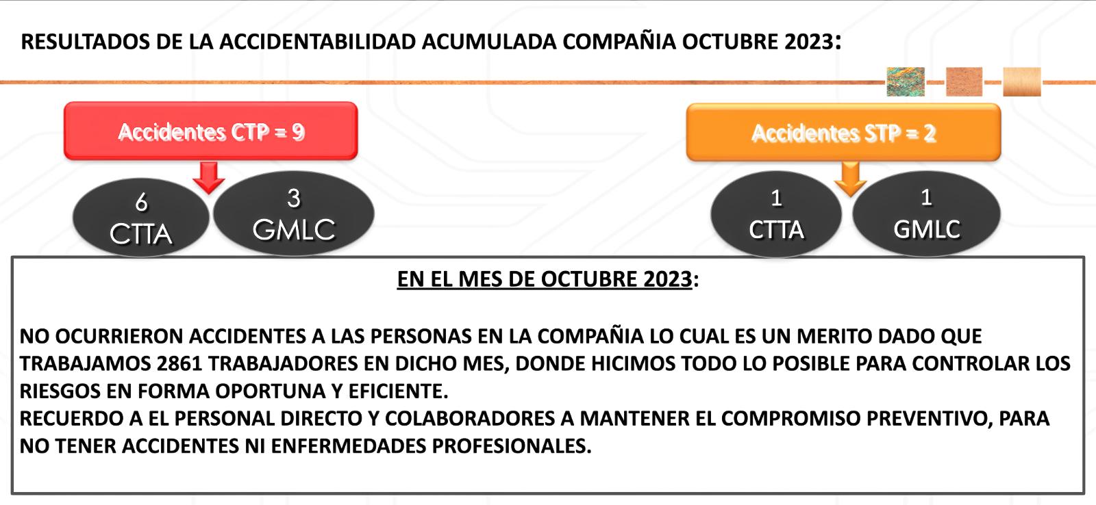 - En el mes de octubre 2023 no ocurrieron accidentes a las personas en la Compañía. Esto es un mérito de los 2.861 trabajadores que trabajamos en octubre, haciendo todo lo posible para controlar los riesgos en forma oportuna y eficiente.
