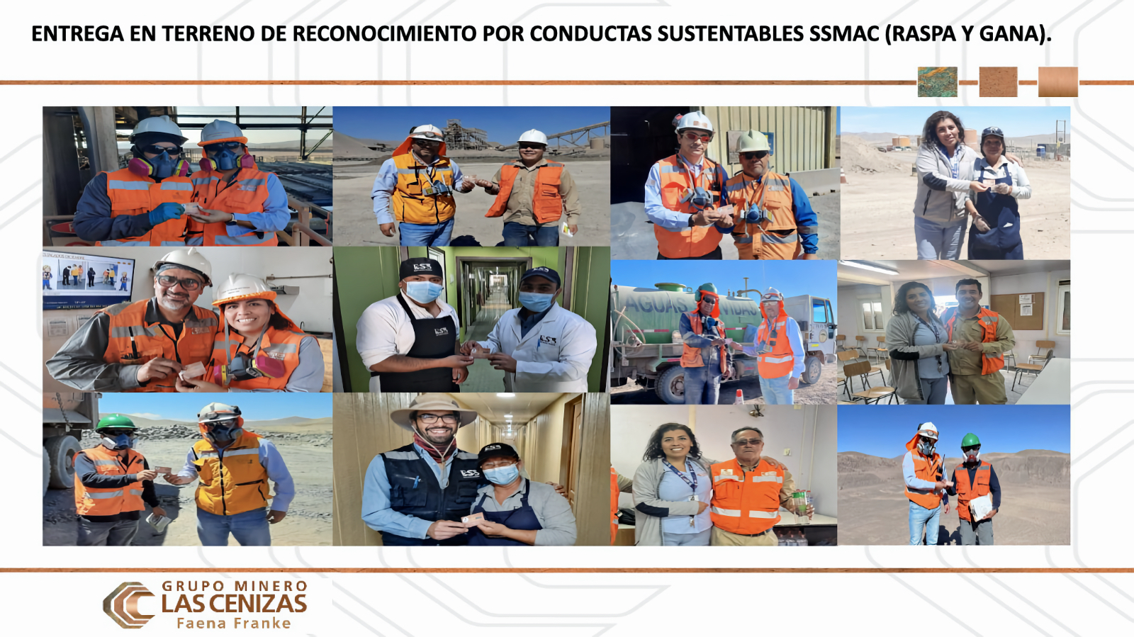 - Entrega permanente de reconocimientos en terreno por conductas sustentables “SSMAC”, según plan de acción campaña corporativa «Raspa y Gana» de Campaña Corporativa Autocuidado (AC), Mutuo Cuidado (MC) y Conductas Sustentables “SSMAC” (CS SSMAC).