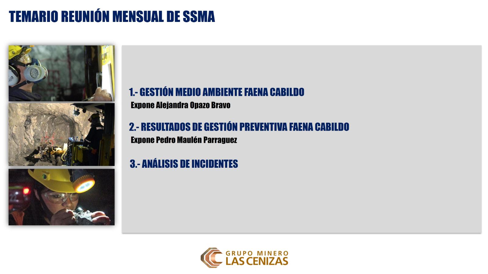 La instancia se realizó en la Sala de Capacitación de Minera Las Cenizas Cabildo y contó con la presencia del Gerente de Operaciones Corporativo, René Fonseca; el Superintendente Corporativo Prevención de Riesgos, Alberto López; y el Gerente de Construcción y Proyectos de Infraestructura, Fernando Robles; acompañados por el Gerente de Operaciones, superintendentes y jefes de áreas de Faena Cabildo.