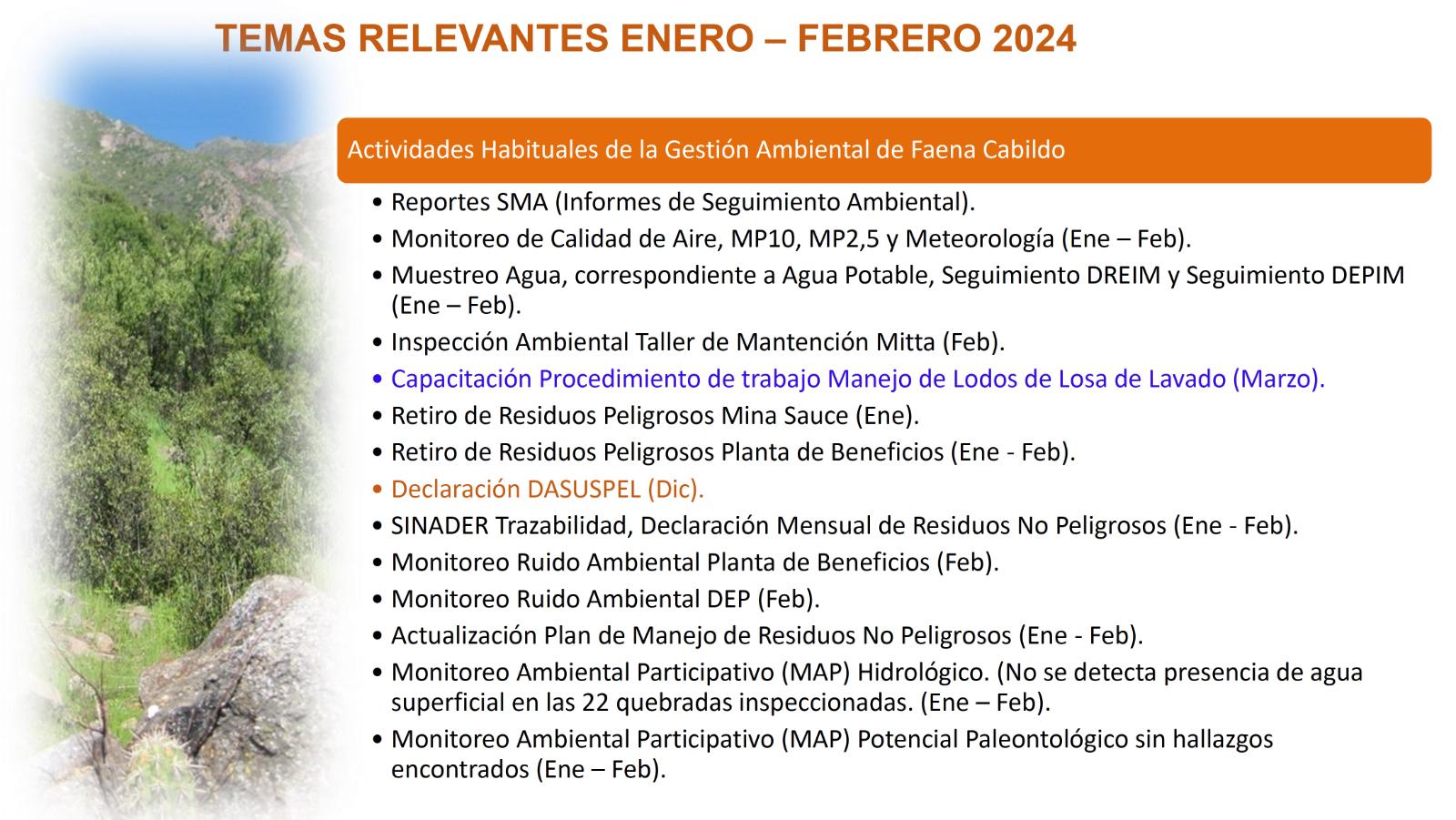 - Liderada por la Superintendencia Corporativa de Prevención de Riesgos, la reunión de Seguridad, Salud Ocupacional, Medioambiente y Comunidad (SSMAC) tuvo como finalidad dar a conocer la gestión medioambiental y preventiva realizada durante los dos primeros meses de 2024.