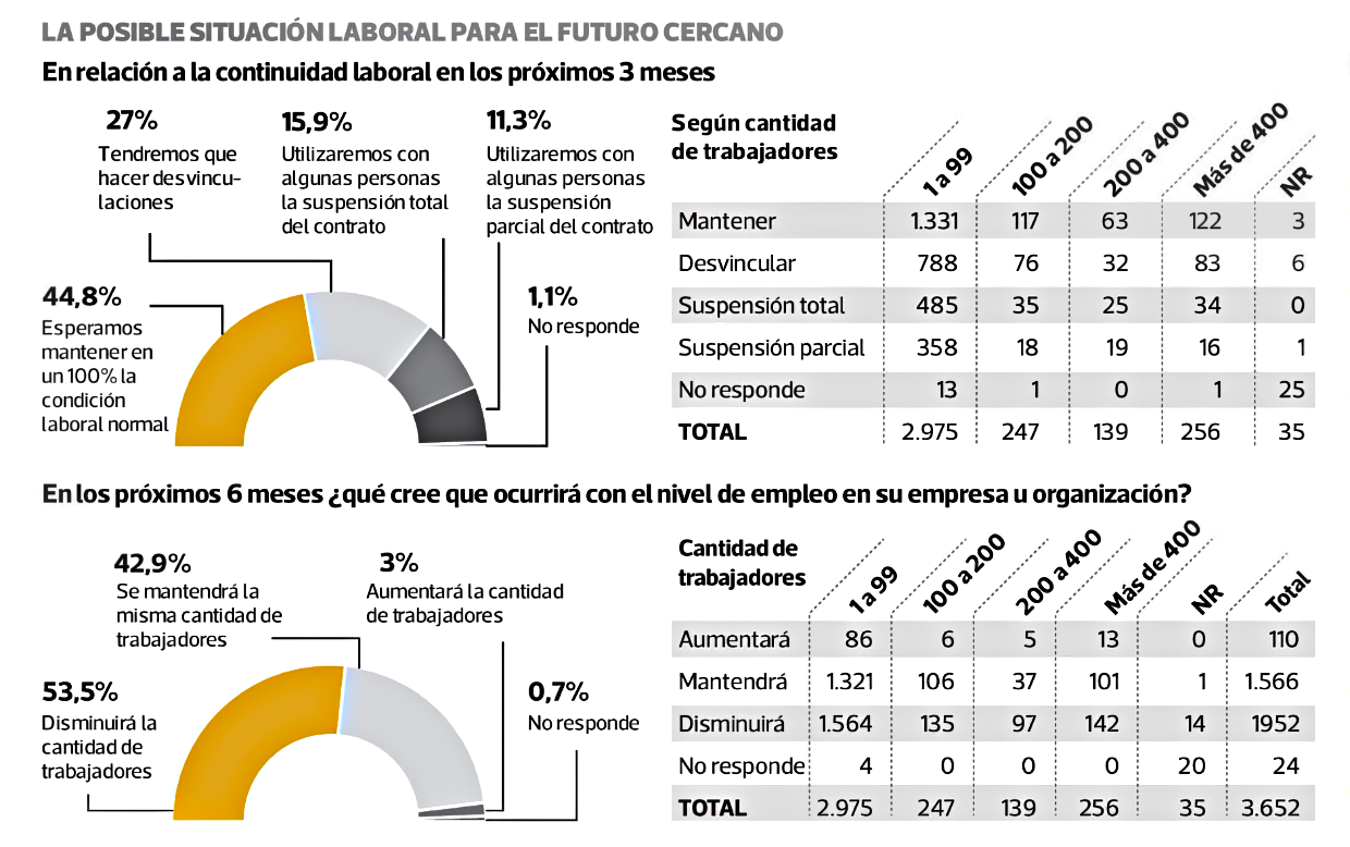 Aunque los anuncios gubernamentales de ayer pueden cambiar mucho la percepción ( y la fecha) de un regreso seguro a los lugares de trabajo, el informe de la Mutual hace una mirada a medio año más. El 54% de los encuestados coinciden que para ese tiempo, disminuirá la cantidad de trabajadores, mientras que un 43% espera que se mantenga. Solo un 3% espera un aumento en la cantidad de trabajadores, principalmente en el sector pyme. De hecho, En cuanto a las disminuciones según tamaño de empresa, se espera la mayor baja en este segmento, seguido de empresas de más de 400 personas y de 100 a 200.