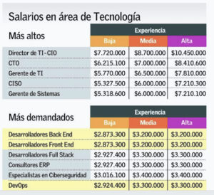 La tabla muestra que si bien entre los cargos gerenciales las diferencias salariales son más altas, entre $7,7 millones y $10,5 millones para un TI-CIO; y $5,3 millones a $7,2 millones para un gerente de sistemas; en el caso de desarrolladores, consultores, especialistas y  DevOps, que son los cargos más demandados, el rango de sueldos que se pagan en Chile oscila entre $2,9 millones y $3,4 millones.