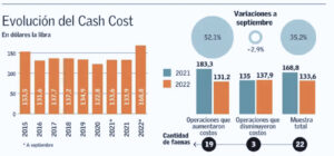 De acuerdo al reporte, en una muestra que representa el 93% de la producción nacional. el indicador cash cost llegó a US$ 168,8, cifra un 26% mayor que el último año, cuando el C1 fue de US$ 133,9,