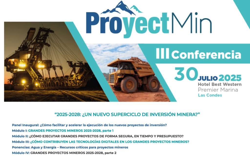 - Proyectmin, punto de encuentro para el sector minero con enfoque en el cobre, anuncio la realización de su 3ª Conferencia “2025-2028: ¿UN NUEVO SUPERCICLO DE INVERSIÓN MINERA?” que abordará los desafíos y oportunidades de los proyectos mineros previstos para los próximos cuatro años.