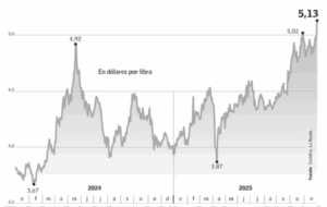 La mayor cotización nominal del año de US$ 5,125/lb al 1 de diciembre 2025 marca un aumento cercano al 7% respecto al año anterior y se explica por factores financieros de un US Dólar más débil, ante expectativas de recortes de tasas por la Reserva Federal, que actúa como catalizador natural para el precio de los commodities.