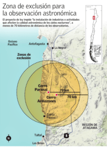 - Iniciativa que prohibiría actividades industriales o productivas que afecten la calidad de los cielos nocturnos por contaminación lumínica o polvo establece una distancia mínima de 70 km alrededor de los observatorios en cerro Paranal y cerro Armazones en la II Región de Antofagasta.