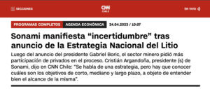 Ante el anuncio de la Estrategia Nacional del Litio que realizó el presidente Gabriel Boric, el presidente (s) de la Sociedad Nacional de Minería (Sonami), Cristián Argandoña, comentó en Agenda Económica de CNN Chile que, como entidad, “nos quedamos con bastante incertidumbre”.