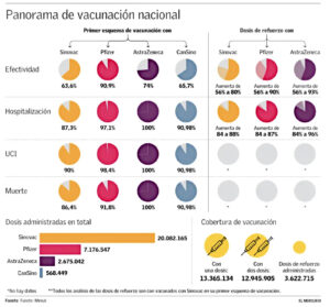 En cuanto a la prevención de hospitalización, la efectividad de la vacuna de refuerzo CoronaVac sube de 84% a 88%, con Pfizer-BioNTech aumenta de 84% a 87%, y AstraZeneca crece de 84% a 96,3%.