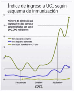 Al observar los ingresos a unidades de cuidados intensivos, se aprecia que la hospitalización por cada 100 mil habitantes ha aumentado más rápido entre quienes no han completado su vacunación.