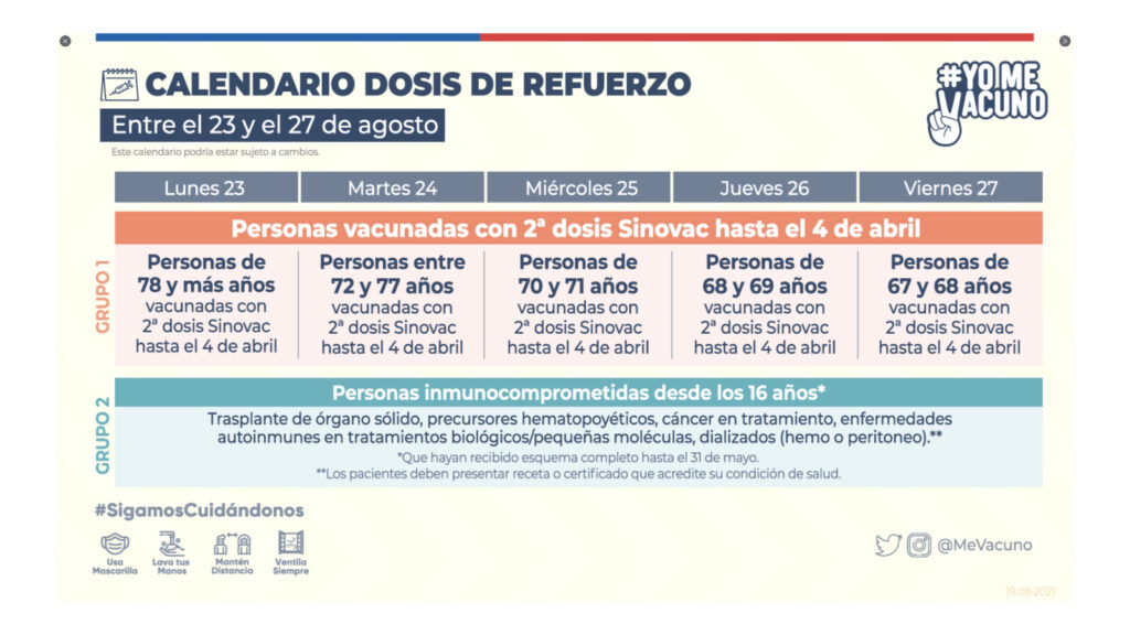 Según indicó la subsecretaria de Salud Pública, Paula Daza, entre el 23 y el 27 de agosto, y del 30 al 3 de agosto podrán recibir su dosis de refuerzo aquellos que recibieron su segunda dosis Sinovac hasta el 4 de abril. Todo esto, en base a la edad.