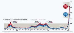 El análisis compara las cifras de «casos reportados» y «casos corregidos» y plantea que éste último, al 28 de enero de 2022, fue de 41.220 y no los 26.727 reportados.