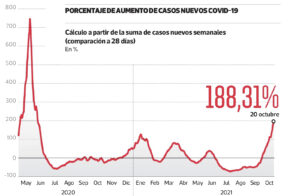 Pese a que en los números absolutos la cifra de contagios diarios aún se mantiene muy por debajo de la ola registrada entre abril y junio de este año -cuando se superaron los nueve mil contagios-, el aumento registrado en las últimas semanas ha superado la velocidad de todos los brotes registrados en 2021.