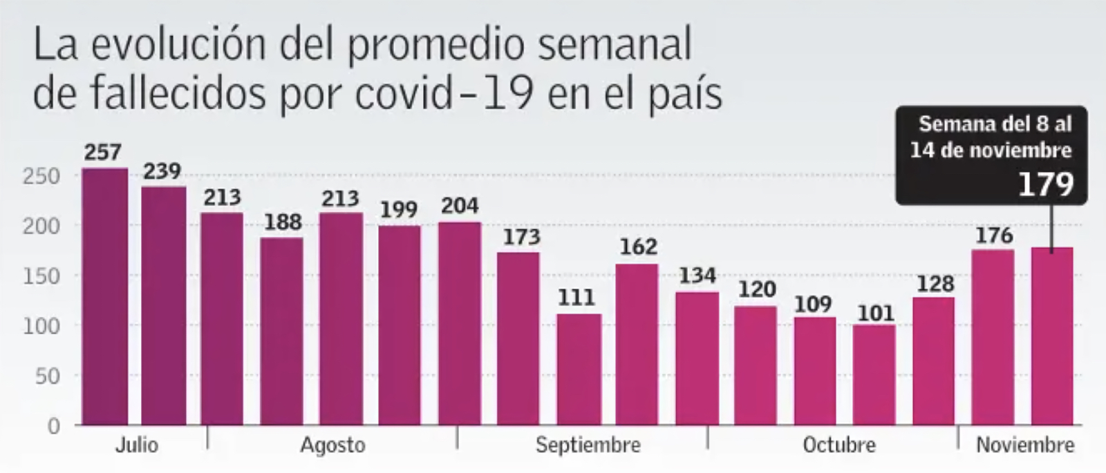 De acuerdo a las cifras oficiales, solo un mes la cantidad de fallecidos a causa del virus ha aumentado en 77%, observándose una concentración de muertes entre los adultos mayores: 93, 1 % de los fallecidos tienen más de 60 años.