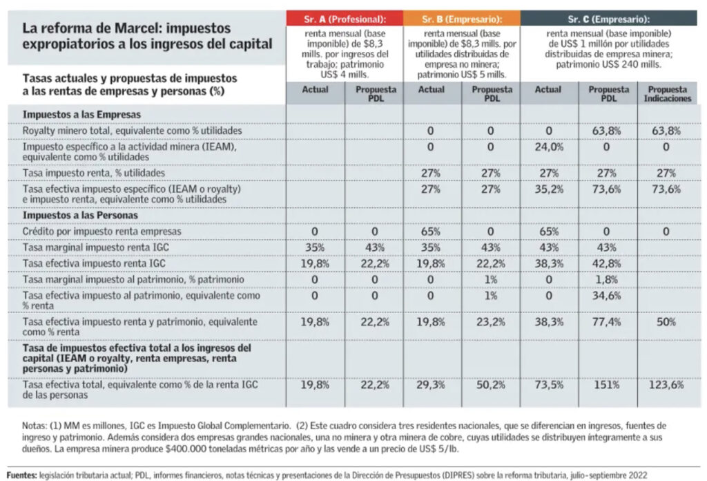 El actual impuesto específico a la actividad minera (IEAM) del cobre, que grava hasta en 24% las utilidades, sería sustituido por un royalty a la minería que grava hasta en 63,8% las utilidades del cobre. Considerando además la tasa de impuesto a la renta de 27%, la combinación de esta y el royalty implicarían una tasa efectiva total de hasta 73,6% de las utilidades de las grandes mineras, que más que duplica la tasa efectiva (IEAM e impuesto renta) actual, de 35,2%. Esta tributación excesiva es la mejor forma de asegurar que los chilenos no invertirán más en cobre.