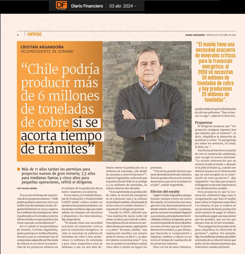 “El mundo tiene una necesidad acuciante de minerales críticos para la transición energética: al 2050 se necesitan 39 millones de toneladas de cobre y hoy producimos 25 millones de toneladas y para 2030, requerimos unos 36 millones; o sea, en seis años debemos elevar la producción en 11 millones de toneladas. ¿De dónde los sacamos y cómo lo hacemos?”, expresó Argandoña, indicando que la producción de Chile en 2023 llegó a 5,25 millones de toneladas, su menor nivel en dos décadas.