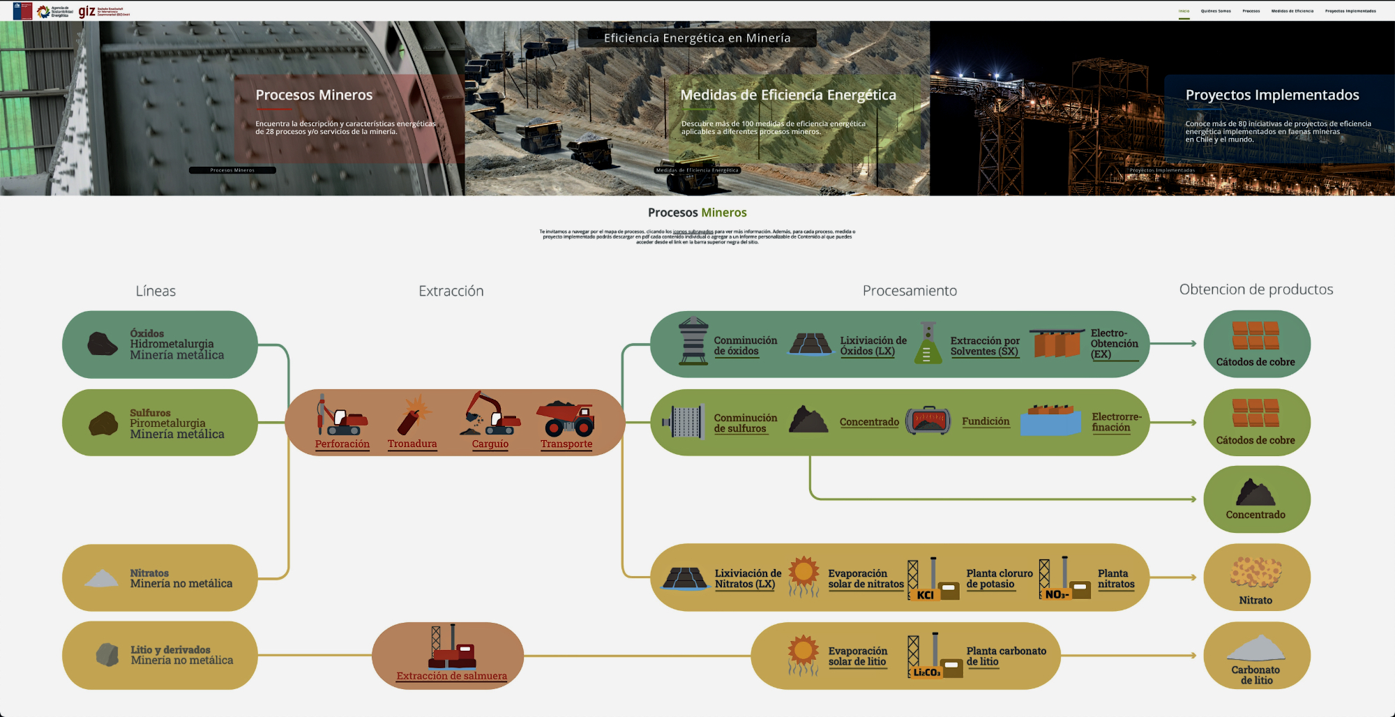 Indica que se diseñó la primera web informativa en español sobre eficiencia en minería (energiaenmineria.cl), que contiene el detalle de 118 iniciativas para distintos procesos, junto a 101 casos de proyectos que han permitido ahorrar más de 5000 MWh de energía anual y más de mil toneladas de emisiones de C02.