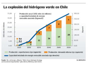 El valor de la producción de hidrógeno verde y derivados se proyecta en US$ 33.000 millones anuales en 2050.- Para enfrentar el catastrófico cambio climático, la humanidad enfrenta una ventana pequeña para cambiar radicalmente sus formas de producción y consumo.