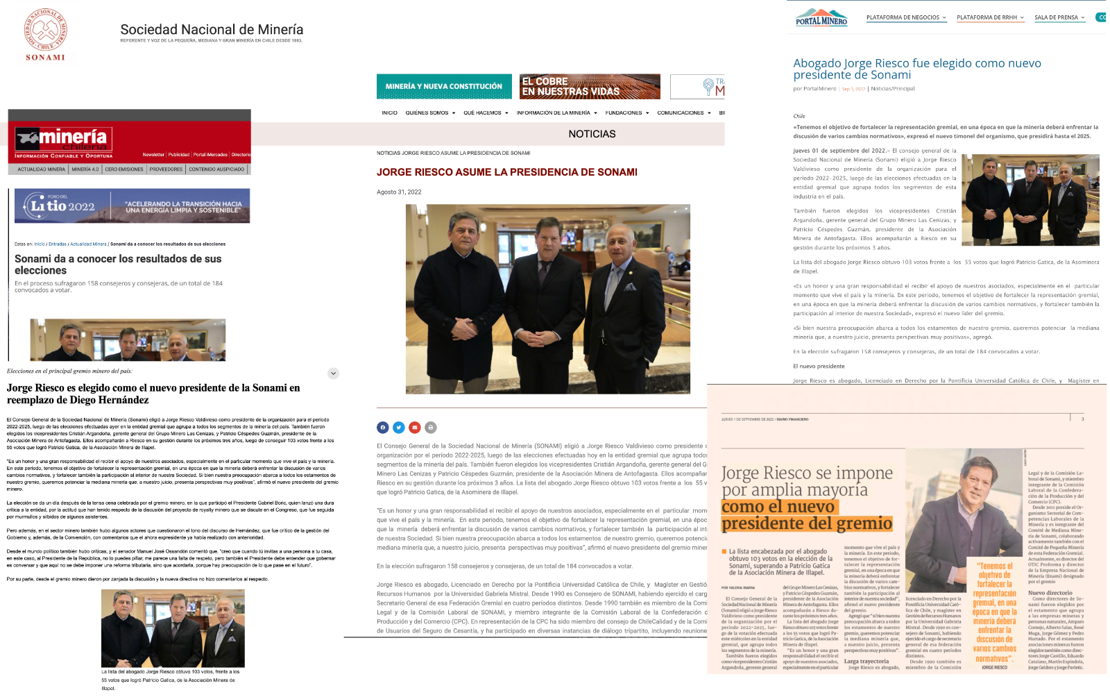 La nueva mesa directiva del principal gremio minero del país quedó integrada por el abogado Jorge Riesco Valdivieso, como Presidente; Cristián Argandoña León y Patricio Céspedes como Vicepresidentes; y, Juana Vives, presidenta de la Asociación Gremial Minera Metropolitana, como Secretaria General.