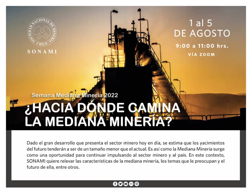 En el marco del Mes de la Minería, la Sociedad Nacional de Minería (SONAMI) está organizando la Semana de la Mediana Minería: ¿Hacia dónde camina la Mediana Minería”, actividad que tiene como propósito relevar el rol de este segmento productivo en el desarrollo futuro de la minería nacional.