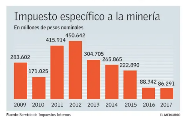 Esto, luego de los cambios introducidos en la ley de royalty posterior al terremoto de 2010, cuando el gobierno de turno pactó con el sector elevar las tasas de 5% a 9% entre 2010 y 2012, a cambio de una invariabilidad impositiva del 4% entre 2013 y 2017,