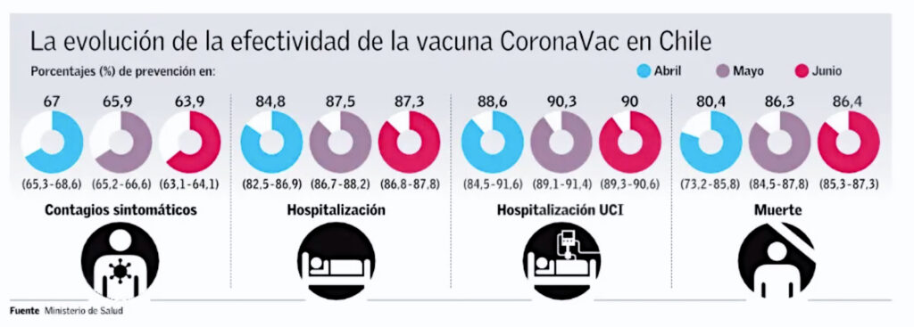 Para Sinovac, inoculada en 8.600.000 individuos mayores de 16 años, los resultados de efectividad después de la segunda dosis fueron: