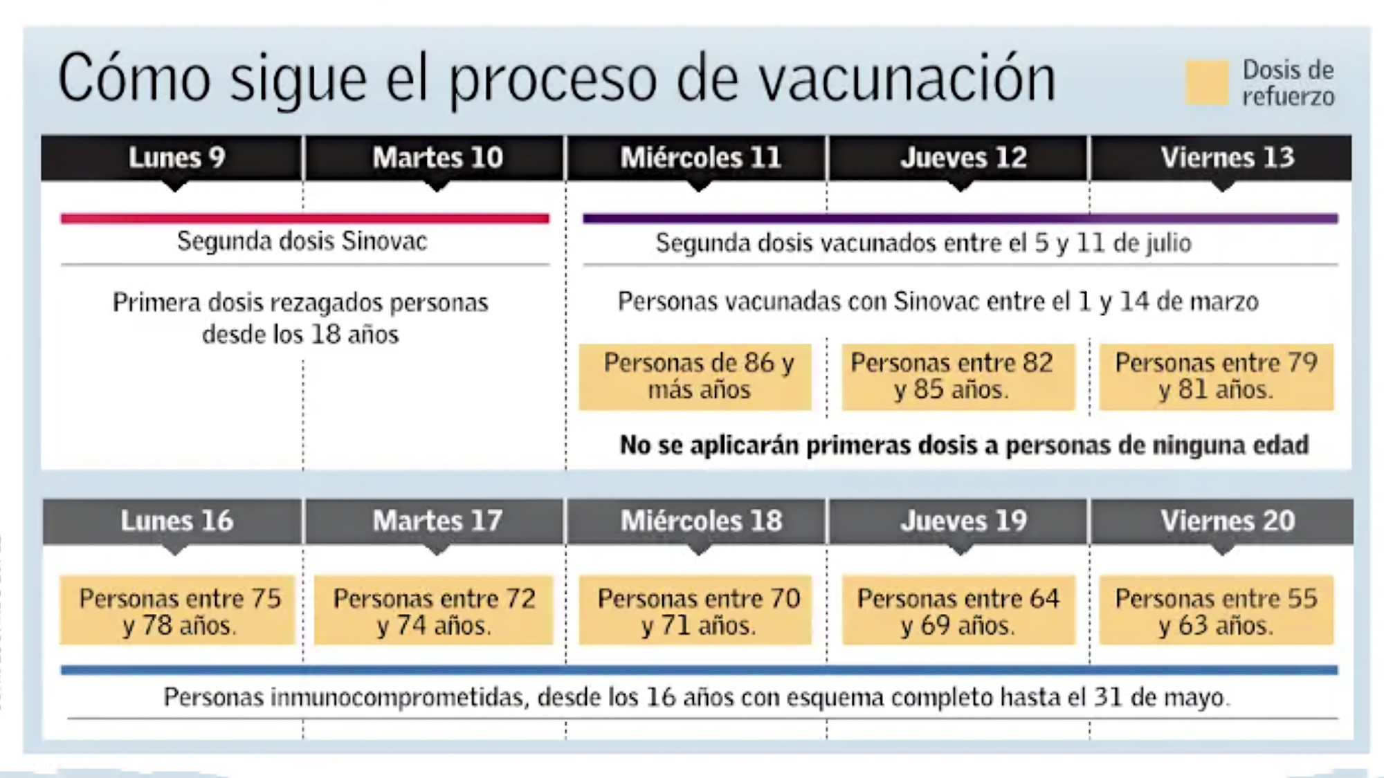 Según expertos infectólogos, la generación del nuevo calendario de refuerzo es algo positivo para el grupo de 65 años o más, con enfermedades crónicas, cuya respuesta puede ser menor. visto que en Sinovac disminuye la efectividad, agregando que al mismo tiempo se debe redoblar el esfuerzo por finalizar la inoculación de rezagados y menores que por cualquier razón, aún no se han vacunado.