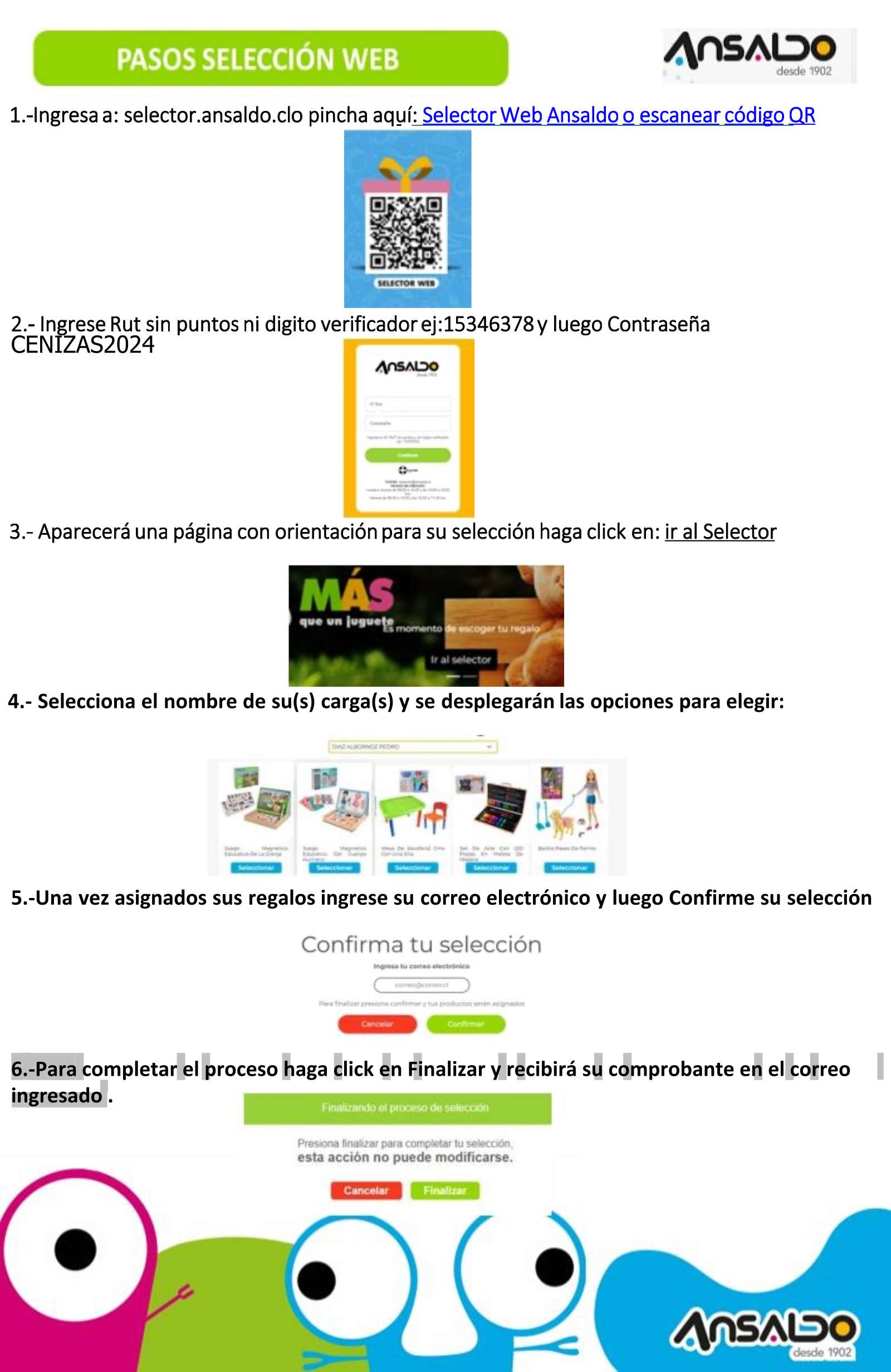 Al igual que en años anteriores se puede realizar la selección en línea, ingresando al link https://selector.ansaldo.cl/modulos/selector/index.php de juguetería ANSALDO, donde los juguetes están clasificados por edad.